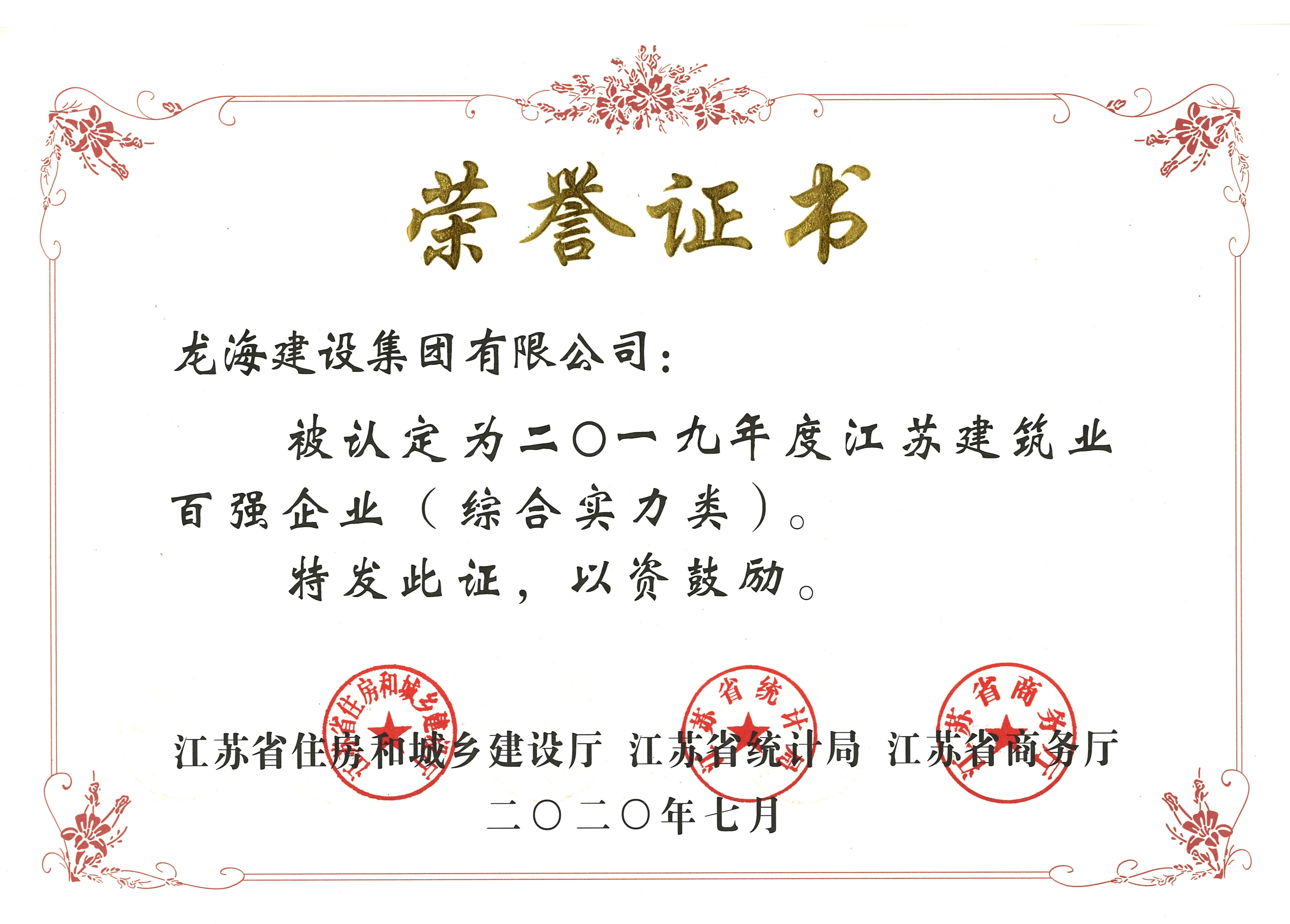 为表扬先进,宣传典型,进一步激发和调动我省建筑业企业改革创新、转型发展的积极性、主动性和创造性,擦亮“江苏建造”高品质发展品牌,省住建厅与省统计局、省商务厅联合开展了2019年度建筑业“百强企业”认定活动。经评审,集团公司脱颖而出,被授予“2019年度江苏省建筑业百强企业(综合实力类)”荣誉称号,位列第三十位,公司已连续多年获此殊荣。